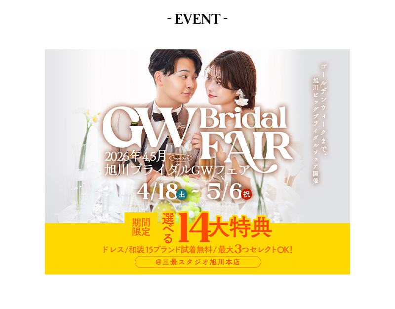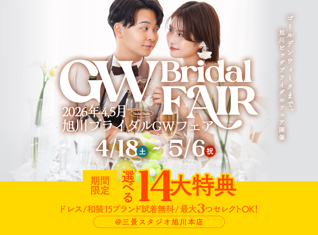 【三景スタジオ】2026年5月6日までの限定開催中!札幌GWブライダルフェア@三景スタジオ旭川本店