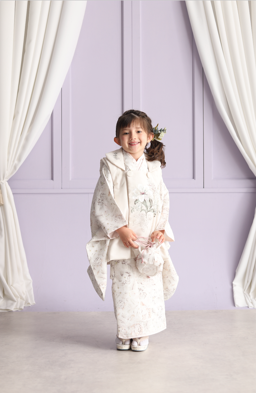 優しいラベンダーカラーの背景は、新しいデザインの洋風の柄が描かれたお着物がおすすめ!