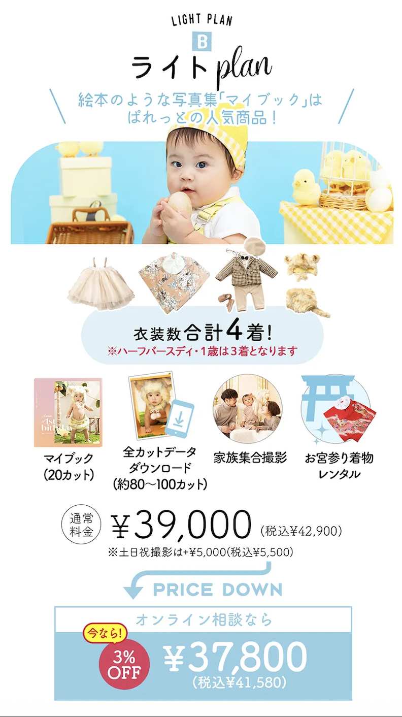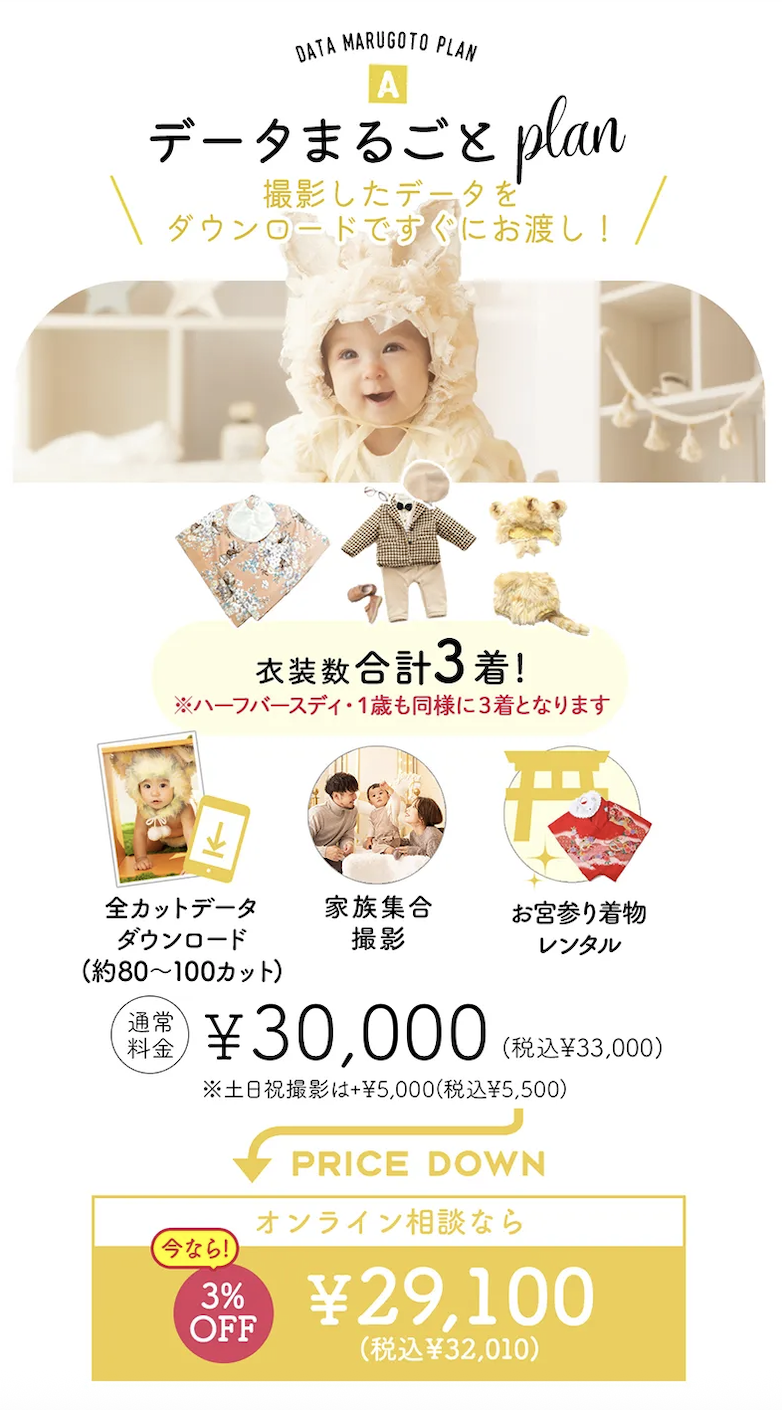 衣装レンタルの利便性: ベビープランには、すべて「お宮参り着物レンタル」が含まれています 。