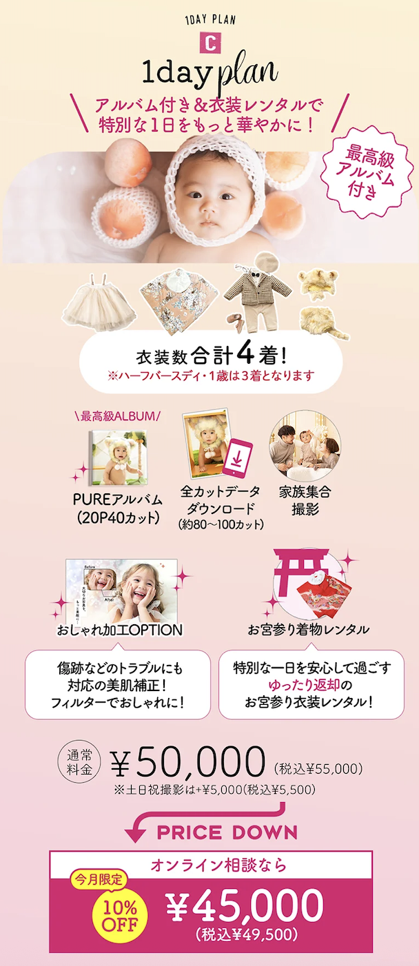①.1歳お誕生日記念の衣装数が通常3着のところ+1着追加で合計4着撮影に!