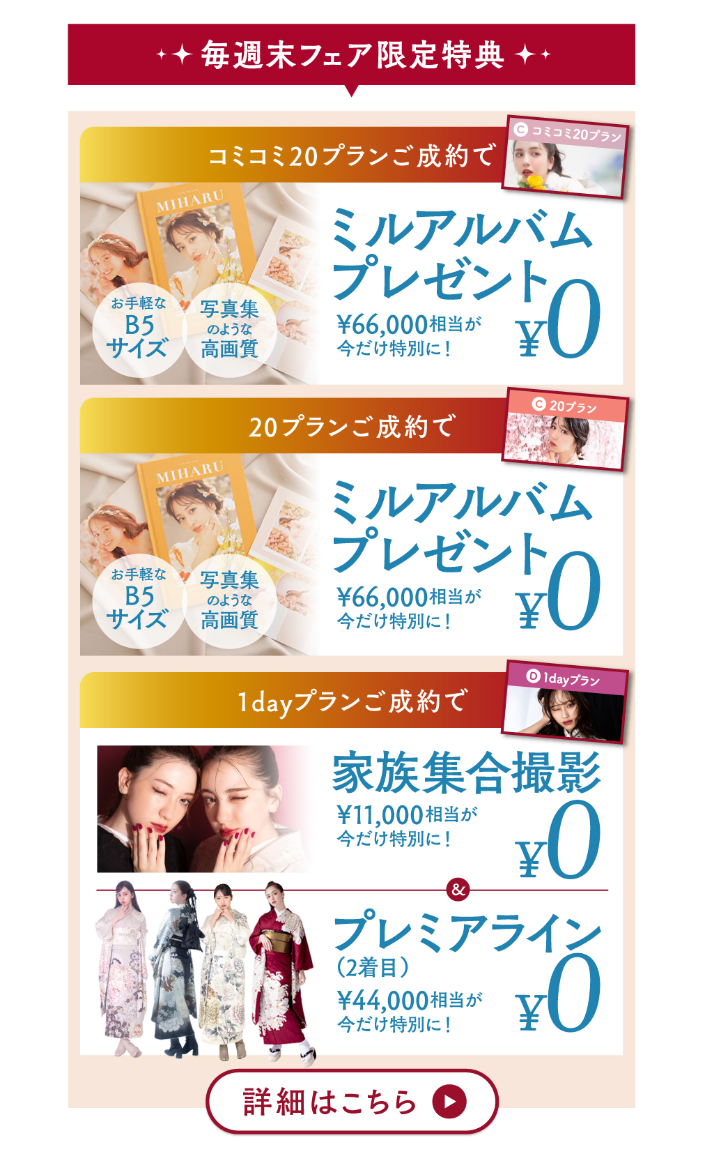 前撮りで超絶人気だった20プランが生まれ変わって再登場!衣装2着の追加料金が0円の20プランが復活!