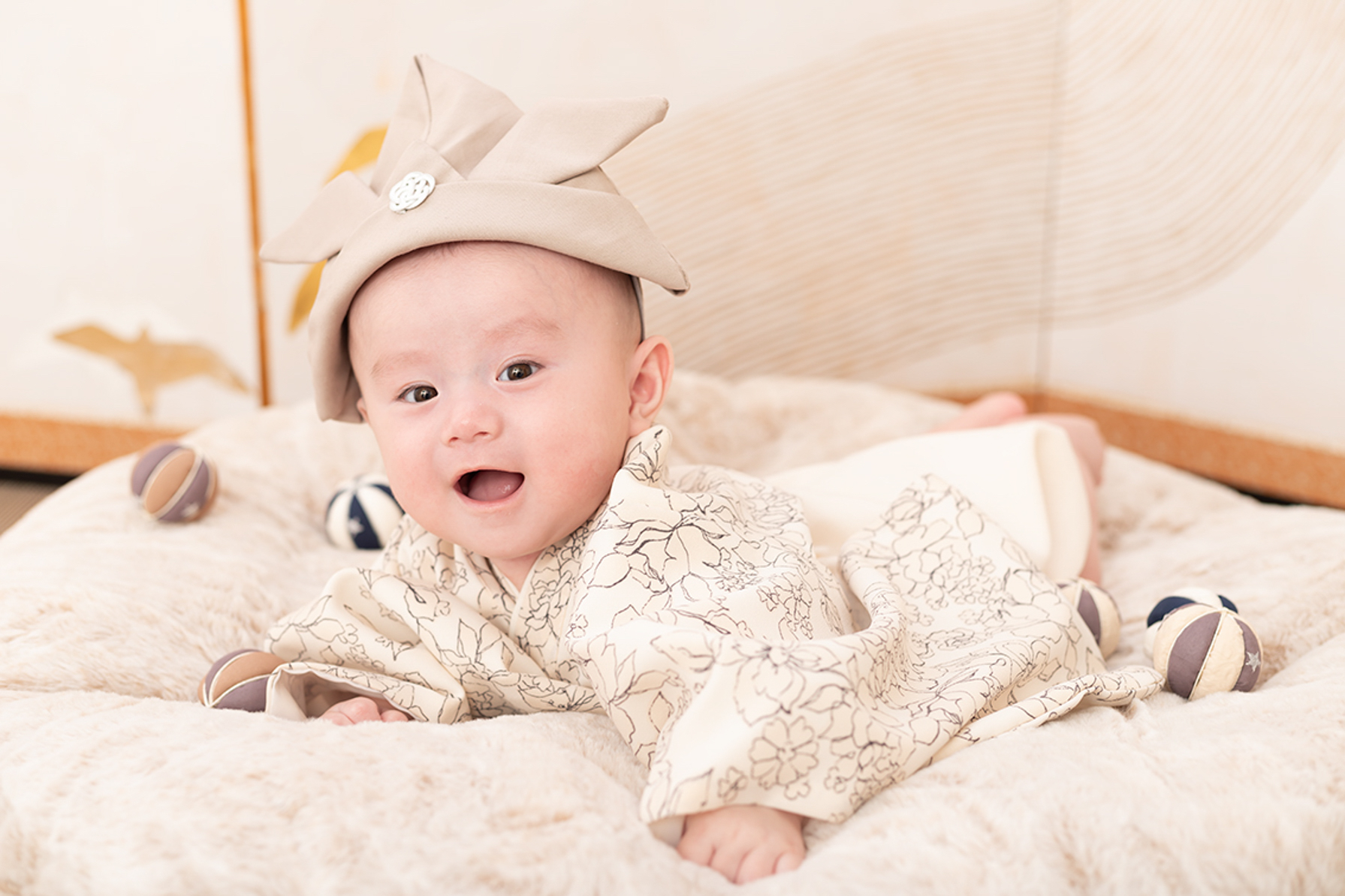 何より大切なのは、パパとママが撮影を思い切り楽しむことです。カメラの後ろでスタッフと一緒に声をかけたり、笑いかけたりしてくれるご両親の姿を見ると、赤ちゃんも安心して自然な表情を見せてくれます。三景スタジオのスタッフは「あやしのプロ」です。ご家族と一体となって、お子様の「今」しかない輝きを引き出します。