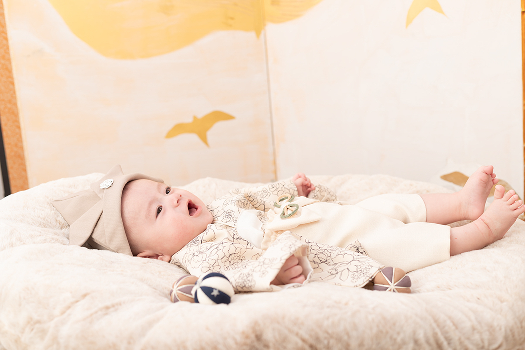 百日記念は、赤ちゃんが「赤ちゃんらしさ」を最も爆発させる黄金期。 三景スタジオのお客様紹介!!百日記念♡おめめぱっちり^o^『つむぎちゃん』かわいいもの♡