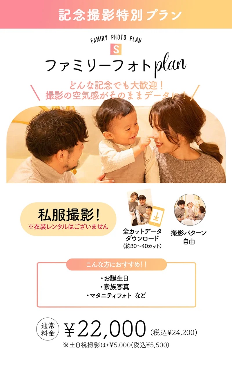 ご家族揃っての撮影も大歓迎です。 「今の私たち」を、三景スタジオで残してみませんか?