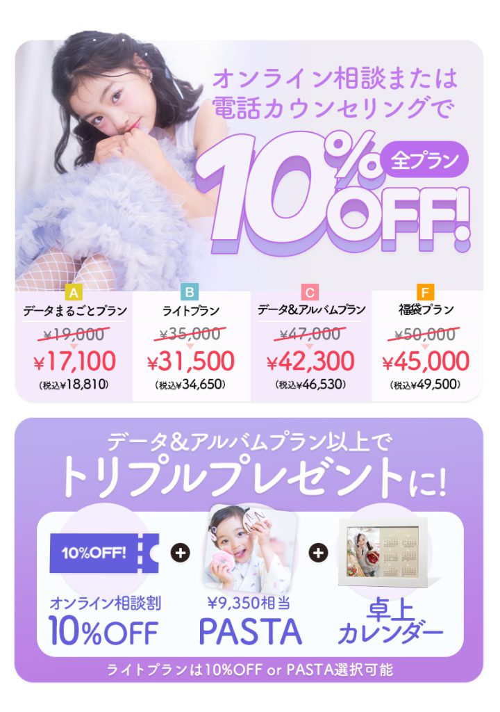 七五三記念と入学記念、スタジオ撮影とロケーションフォト、全部叶えられる贅沢プランです