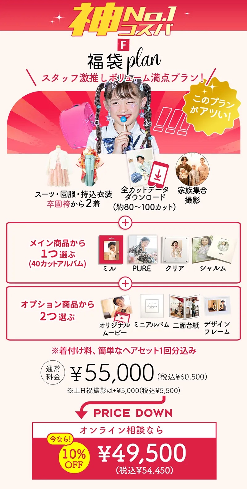 このプランは、全カットデータのダウンロードはもちろん、選べるメインアルバム(40カット)に加え、さらにミニアルバムやデザインフレームなどのオプション商品が2つも付いてくる、まさに「神コスパ」な内容となっています 。
