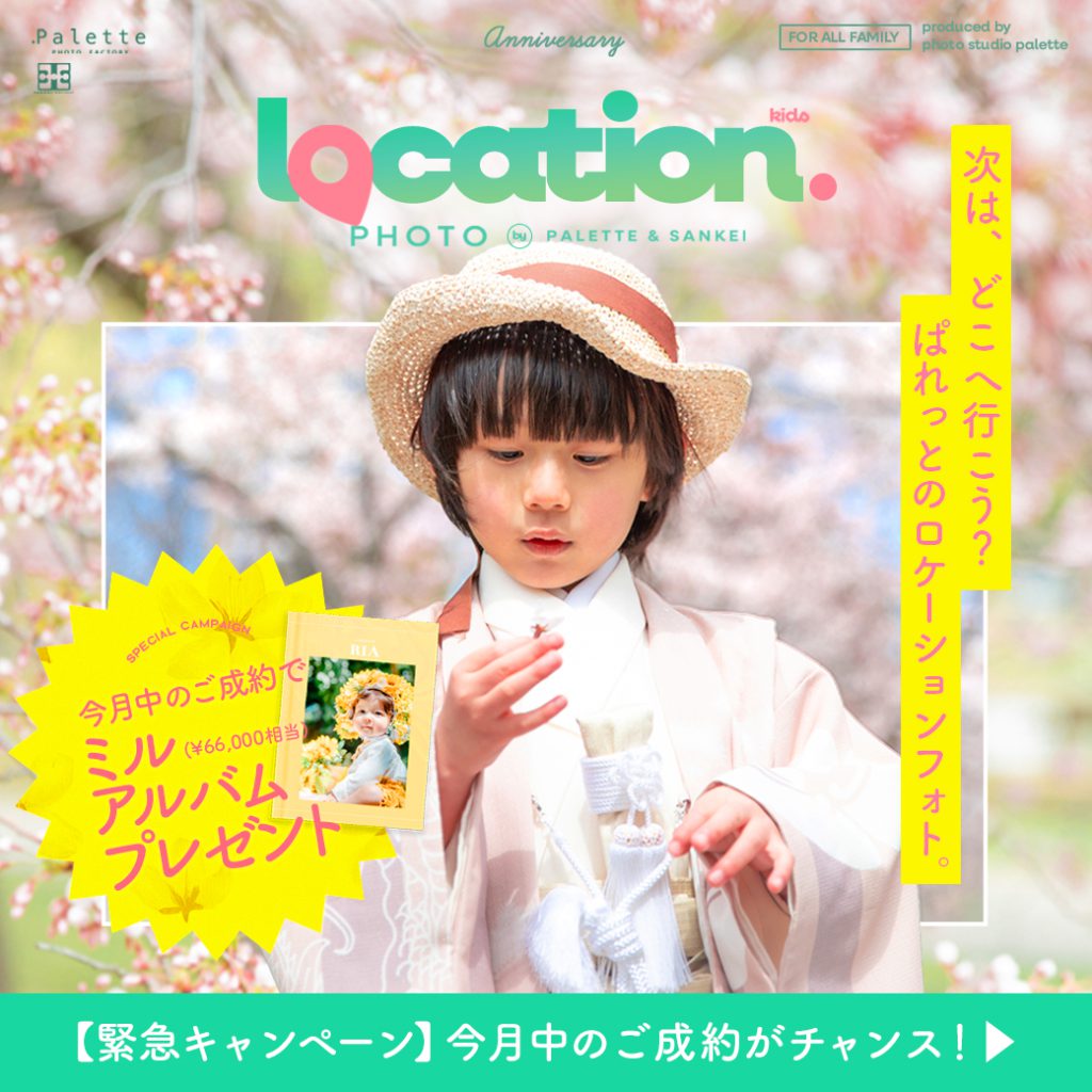 <対象種目> 百日記念、ハーフバースデー、1歳お誕生日 / 七五三記念 / 入学&卒園記念<対象> 今月中にロケーションフォトプランをご成約の方