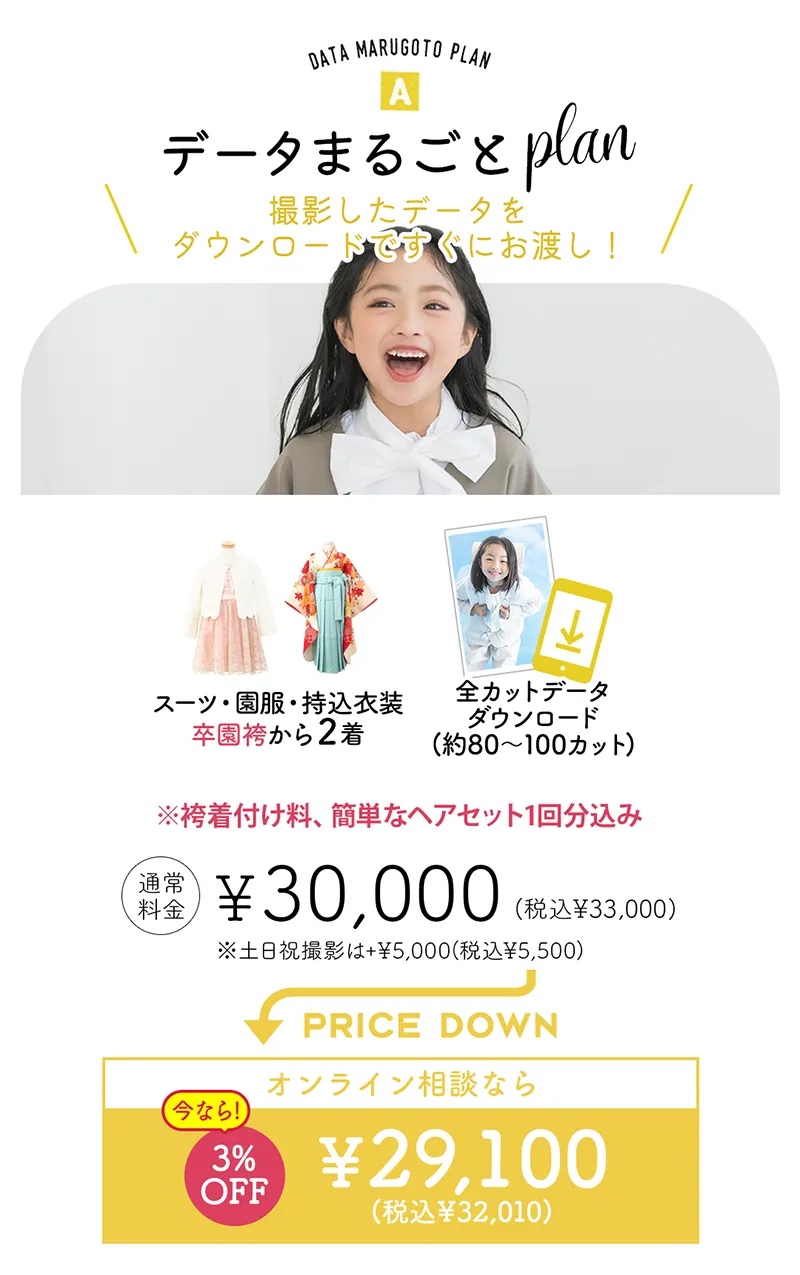 A. 入学プランなら2着、七五三プランなら和装・洋装各1着が基本です。 > 三景スタジオの入学プランでは、スーツ、卒園袴、持ち込み制服などからお好きな2着を選んでいただけます。