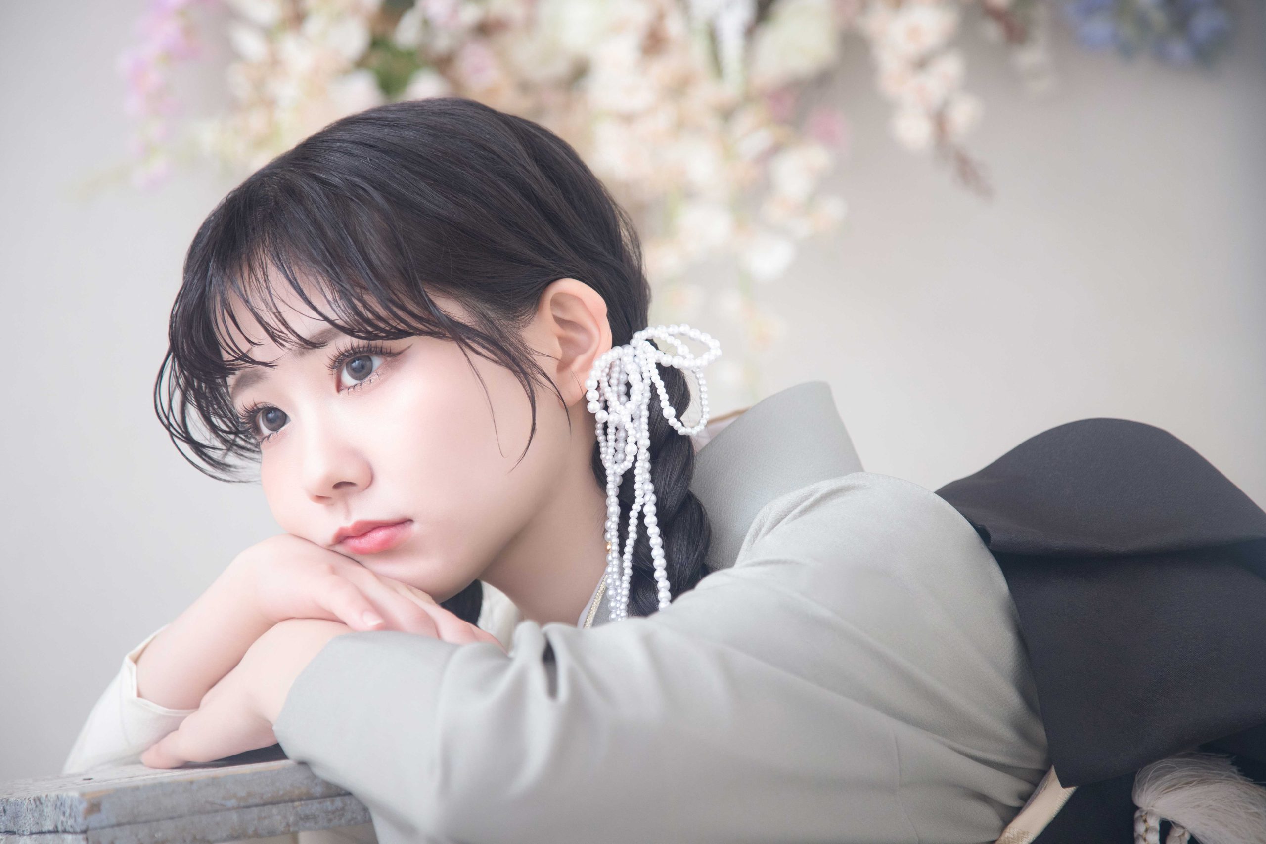 清楚で上品な印象に。レフ板効果でお顔映りが一番綺麗に見える色味です。三景スタジオの明るい自然光が入るスタジオセットとも相性抜群!
