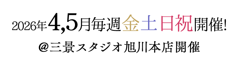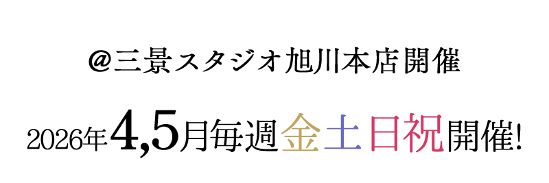 三景スタジオ旭川本店4/17(金) 13:30/15:30 4/18(土) 9:30〜15:30 4/19(日) 9:30/11:30/15:30