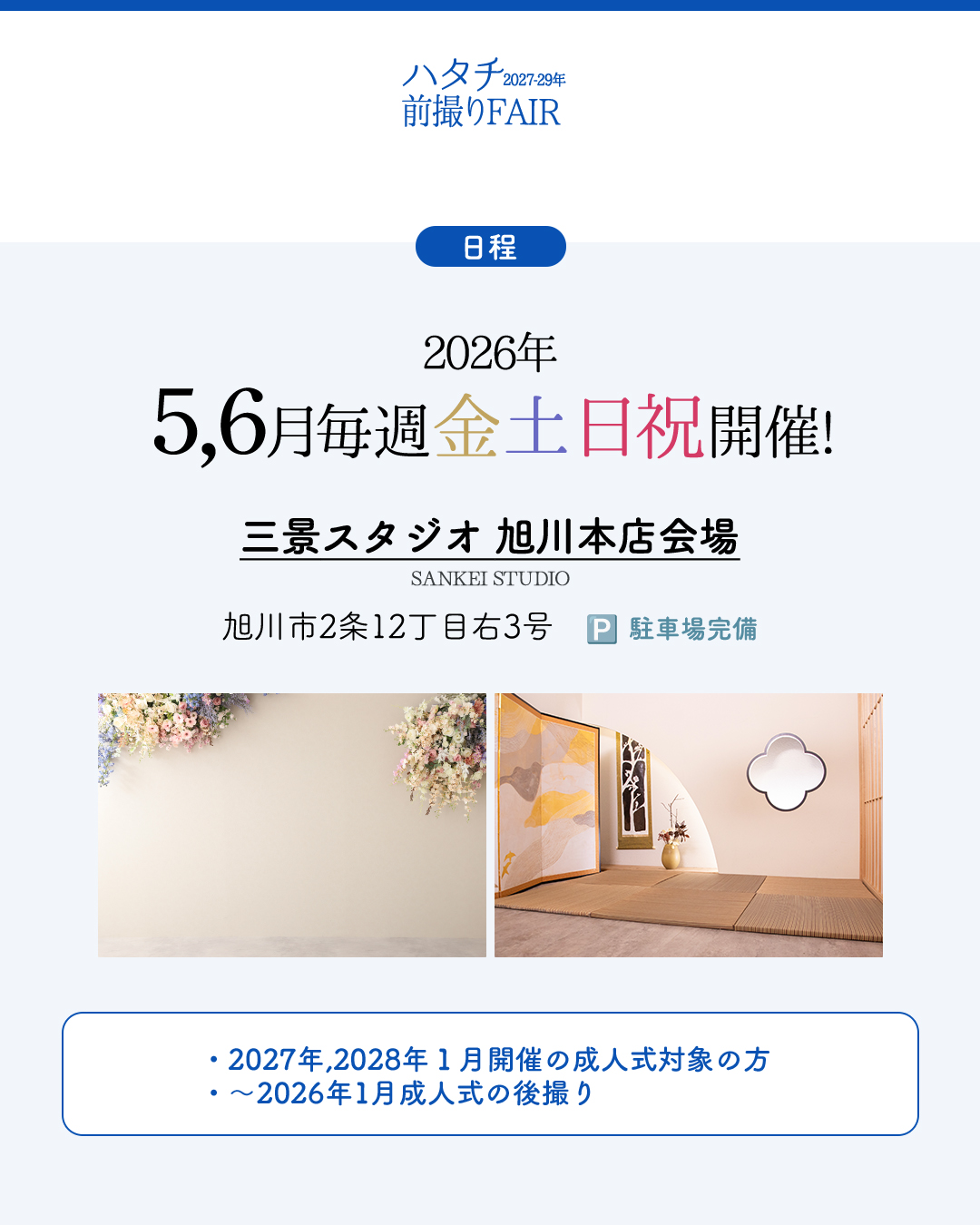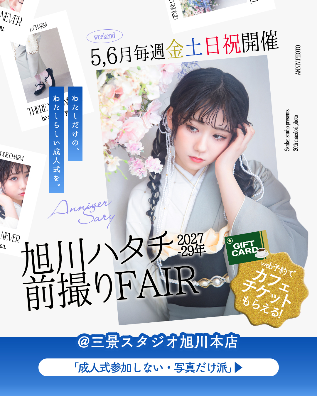 ぜひ一度、三景スタジオ旭川本店の前撮りフェアへお越しください。
