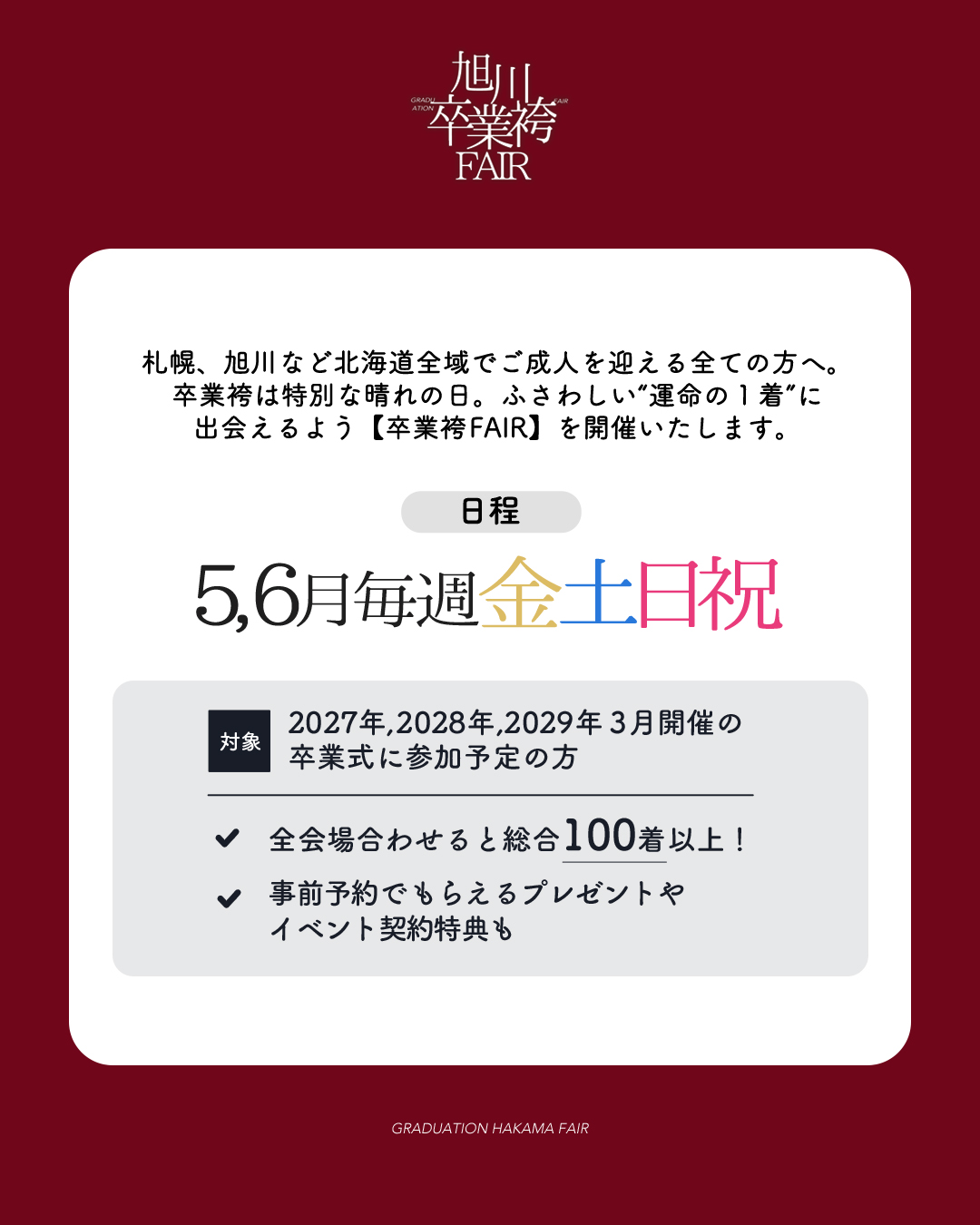【5,6月 金土日祝】旭川卒業袴フェア開催!お待ちしております♪