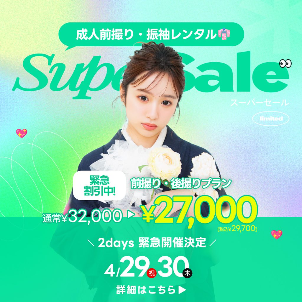 【三景スタジオ旭川本店】電撃プライス!成人振袖”スーパーセール”開催【4/29,4/30の2日間】