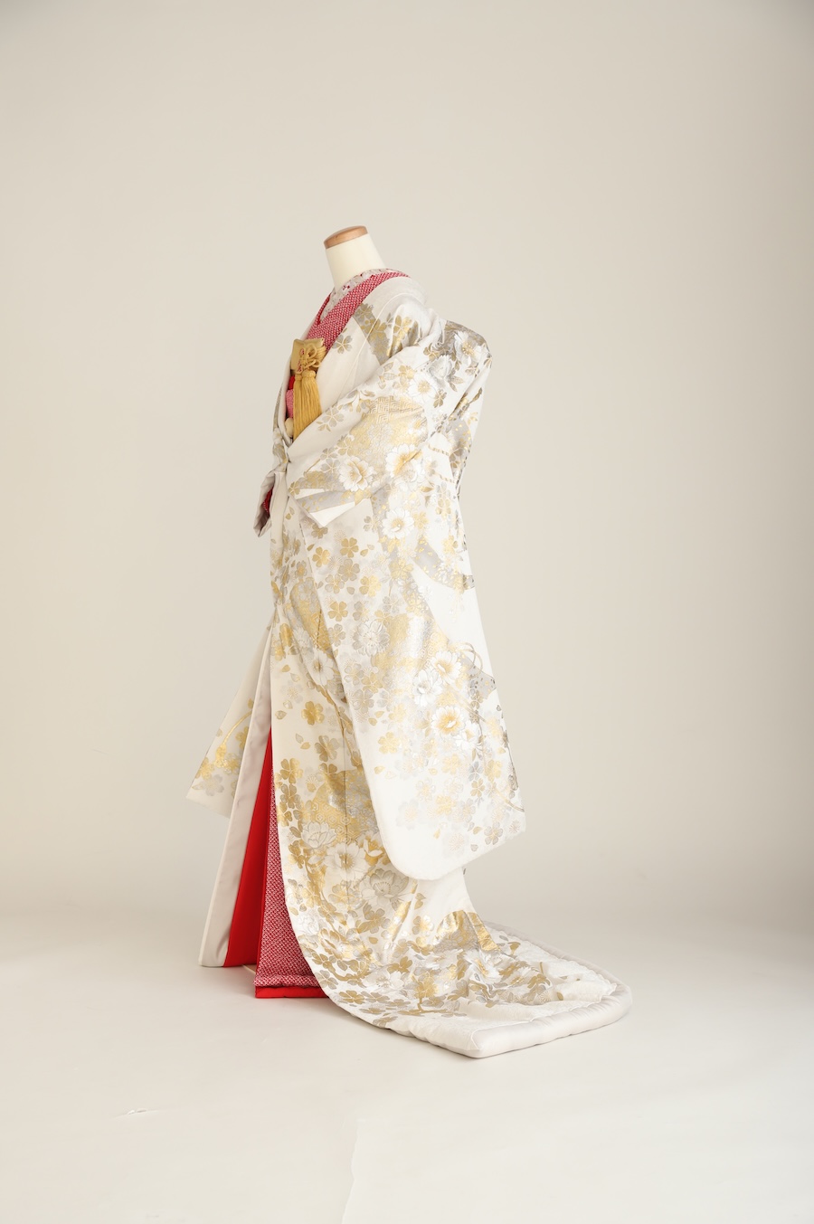 「白無垢=真っ白」という固定概念を心地よく裏切る、豪華なゴールド×シルバーの刺繍が最大の特徴。光の当たり方で表情を変える刺繍は、主役級の存在感を放ちます。