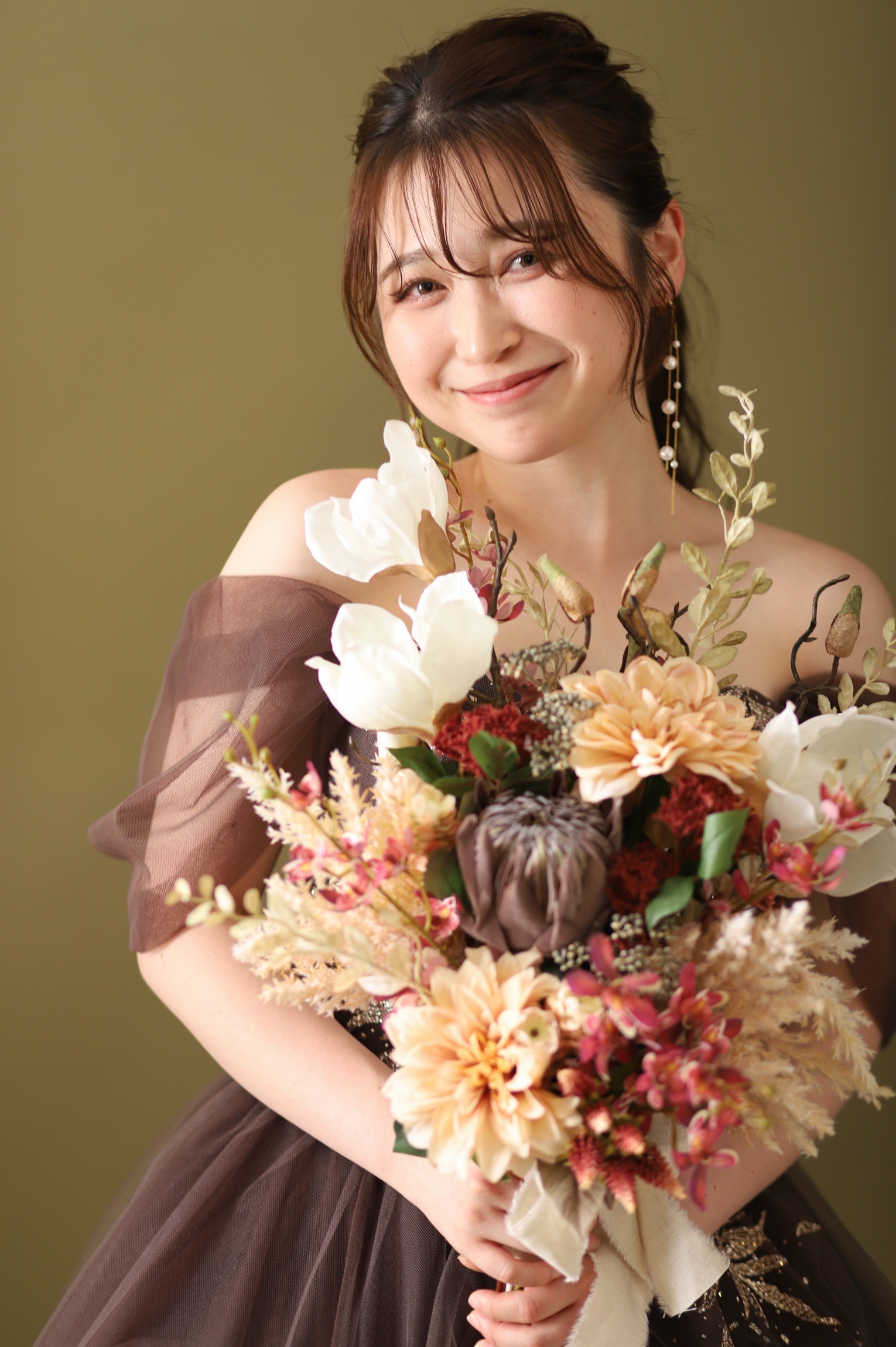 オリーブのような「リーフ」カラーは、ブラウンやゴールドのドレスと合わせると、ぐっと秋らしくクラシカルな装いに。 また、しっとりとした「ブラック/ソフト」は、光を吸い込むような質感で、白い花嫁衣裳や肌の質感を際立たせ、一生ものの肖像画のような1枚を生み出します。