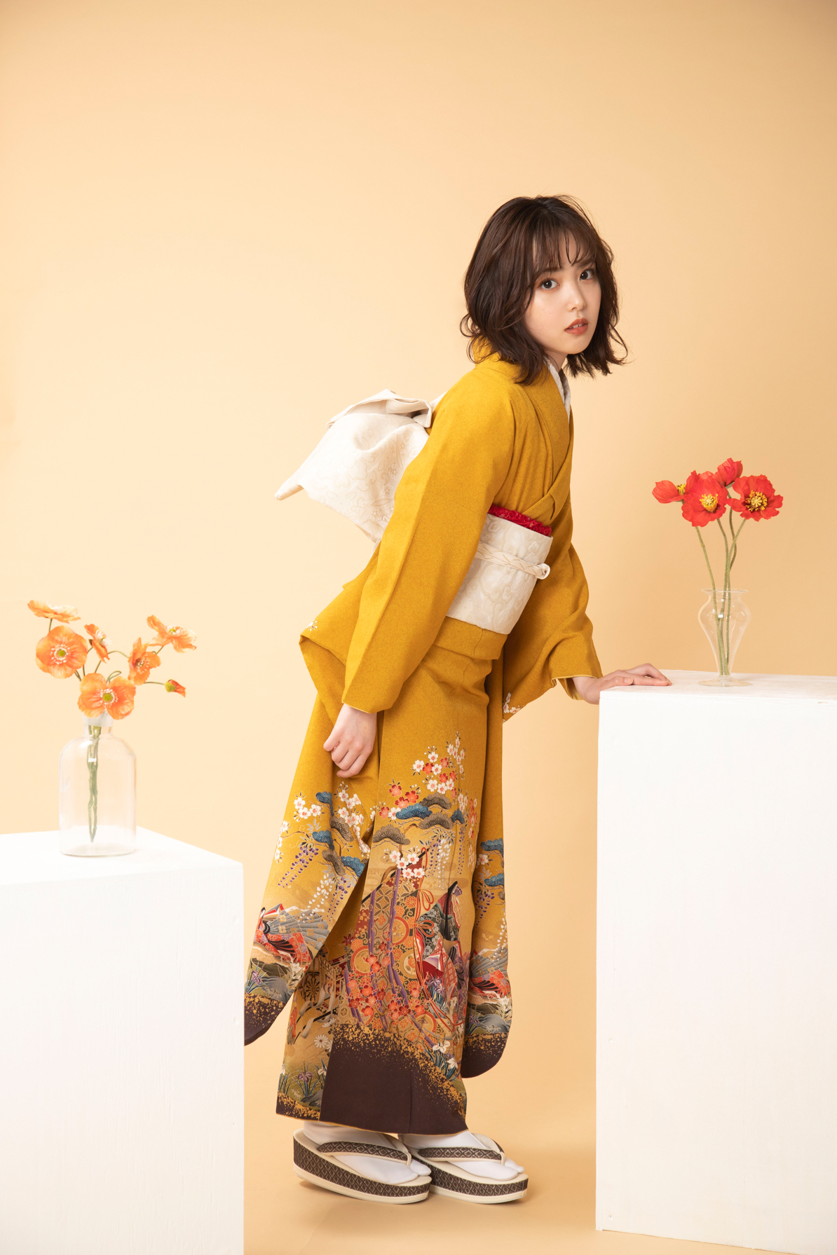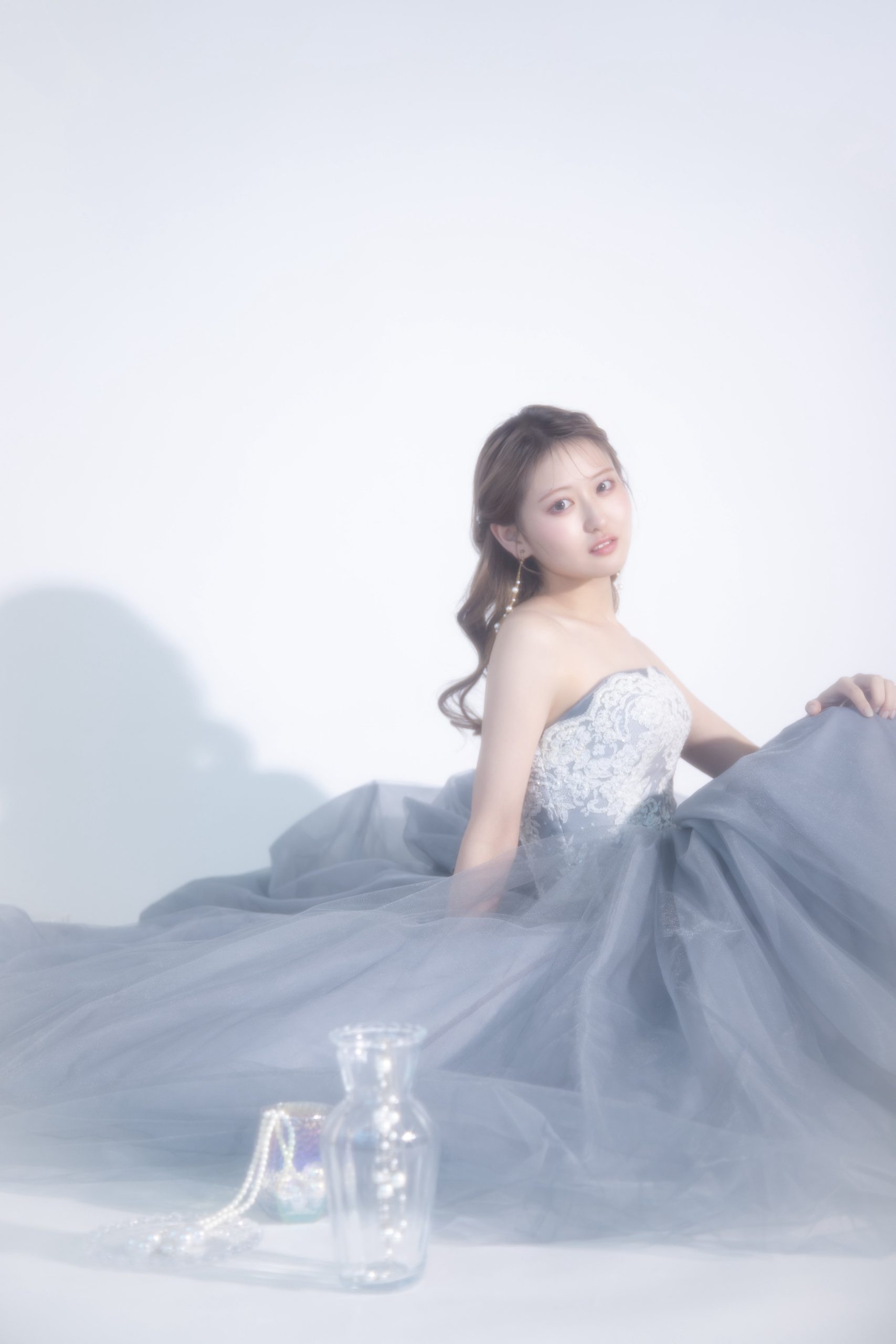 「Pure Classy」な白の背景は、どんな衣装も美しく引き立てる万能カラーです。 柔らかい光を回すことで、肌の透明感がアップし、上品で洗練された印象に仕上がります。大人のウェディングフォトや、二十歳の自分を残す振袖撮影にもぴったりです。