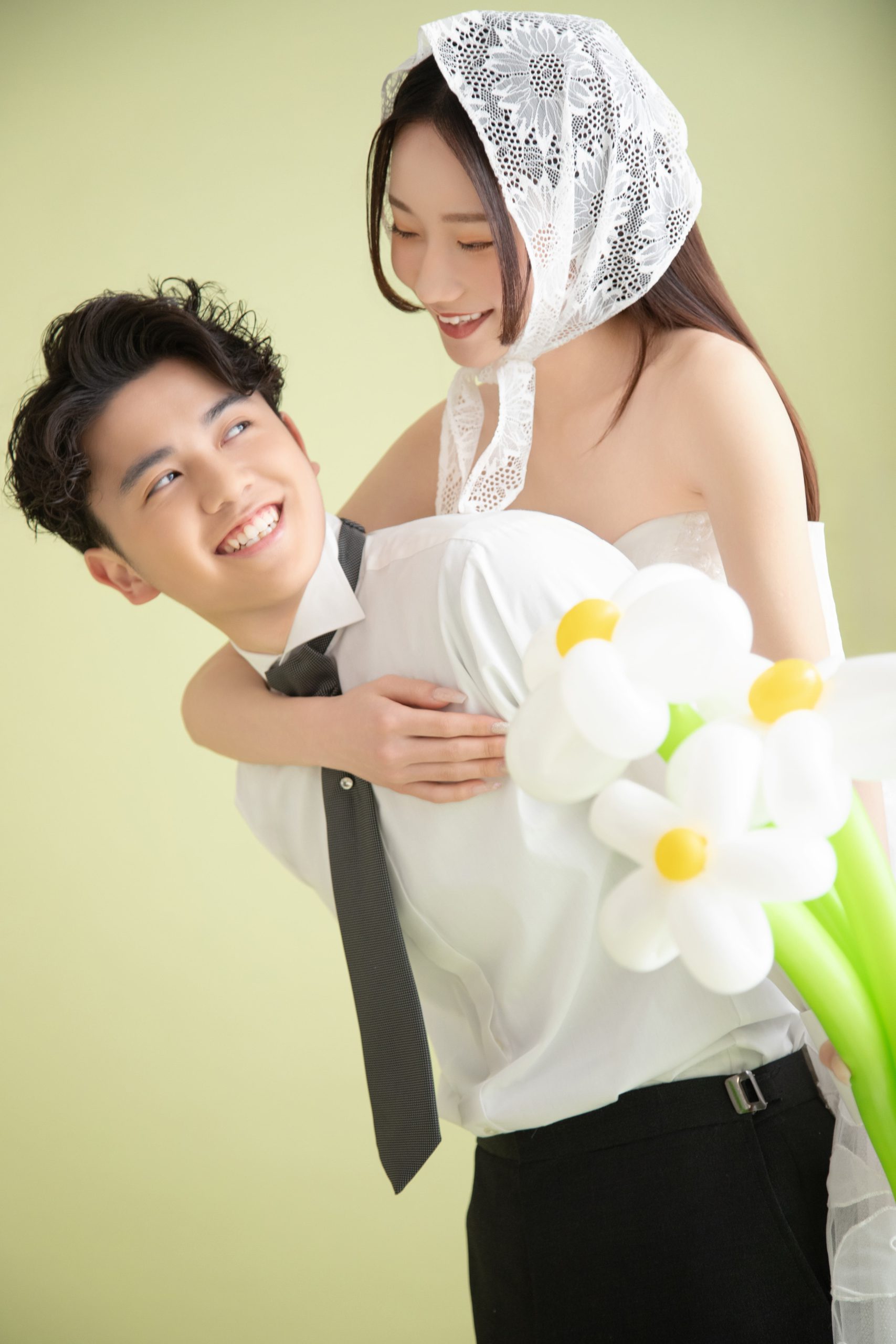 淡いピスタチオグリーンの背景は、優しく穏やかな雰囲気を演出します。 お二人での撮影なら、リラックスした自然な笑顔が引き立つはず。かっちりしすぎず、現代的な「抜け感」のあるおしゃれなお写真を残したいカップルに大人気です。