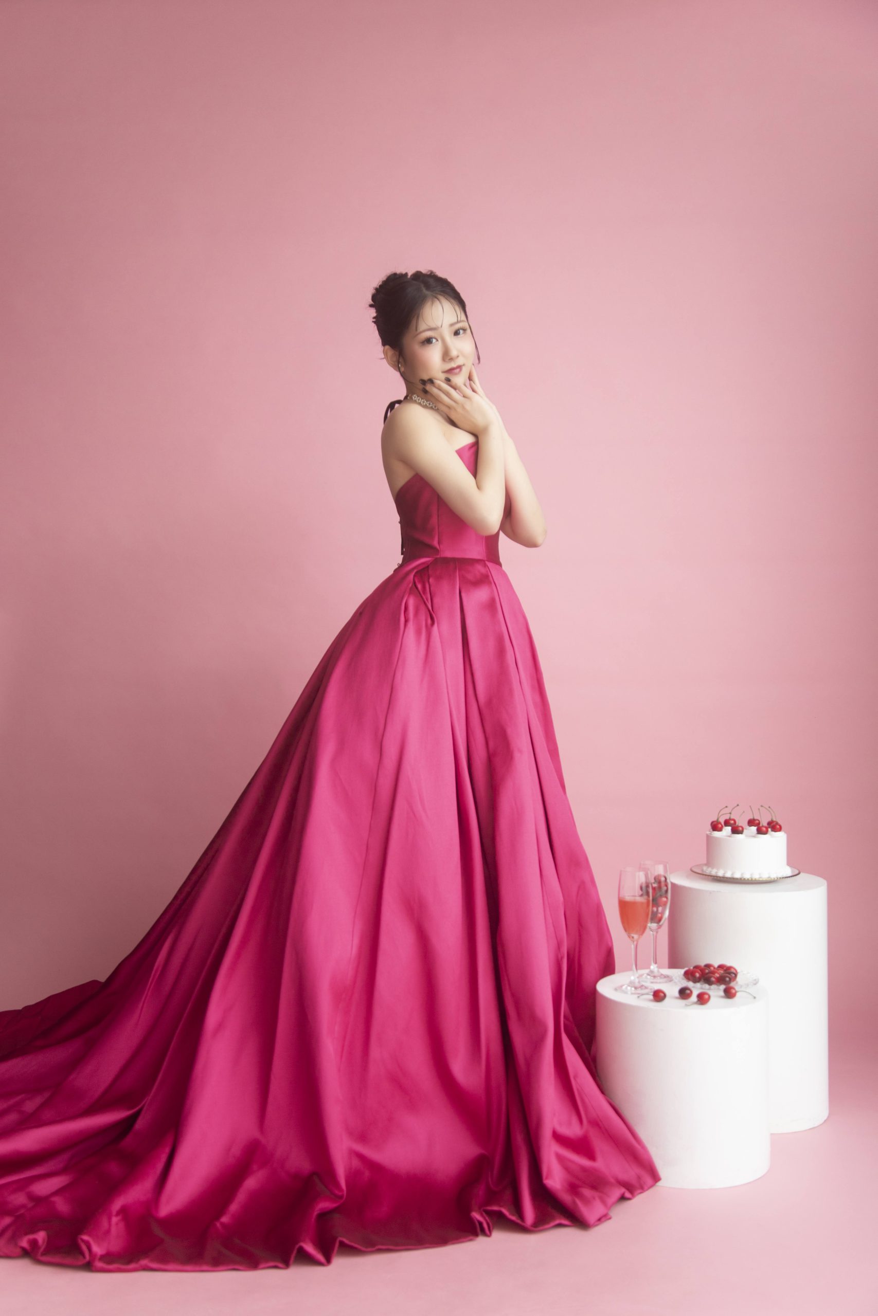 鮮やかなピンクの背景は、ソロウェディングや還暦記念をドラマチックに彩ります。 同系色のドレスを合わせれば、圧倒的な主役感!「いくつになっても可愛いものが好き」そんな女性のときめきを形にする背景です。ケーキやワインなどの小物使いで、よりパーソナルな1枚に。